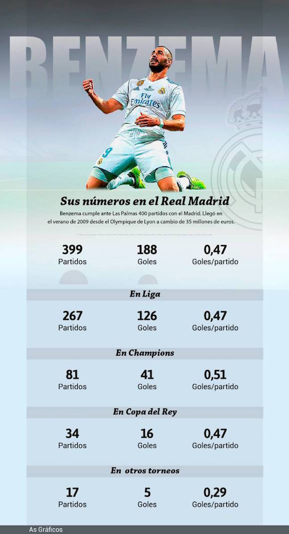 Титулярният централен нападател на Реал Мадрид в последните години - Карим Бензема, е пред своята среща номер 400 за “лос бланкос” във всички шампионати, сочи статистиката на AS. Френският стрелец се чака да доближи юбилейното число в събота против Лас Палмас. До момента Карим е записал 399 мача, в които е отбелязал 188 попадения (средно по 0,47 гола на мач).