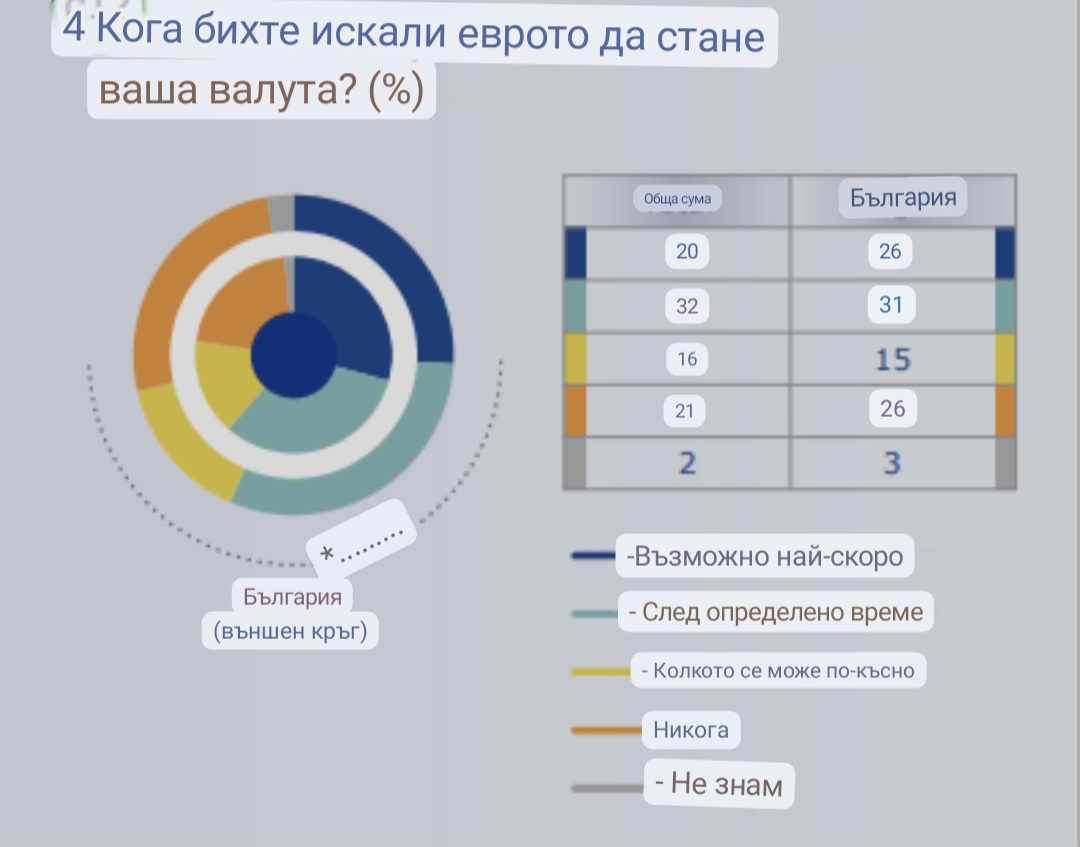 Настроенията, вярванията, опасенията и съмненията на нашенци обаче необичайно се отразяват върху желанията им за приемане на еврото. Една четвърт желаят неотложно приемане на валутата, близо 1/3 пък се придържат към тезата " Еврото е належащо, само че да го приемем след несъмнено време ". " Нека го приемем, само че да бъде допустимо най-късно " - протакат до последно 15% от хората. Според тайминга, едвам 26% или още веднъж една четвърт от популацията не желае в никакъв случай еврото да стане национална валута на България.