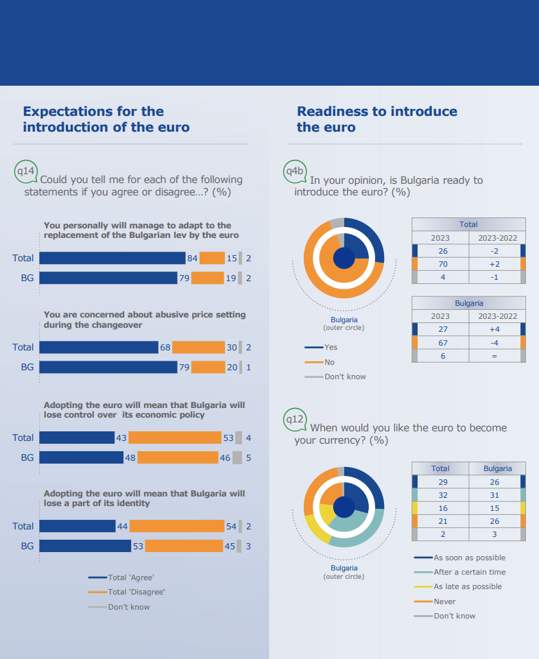 Близо 80% от интервюираните смятат, че ще има далавера с цените. Около половината нашенци /48% от анкетираните/ смятат, че България ще загуби надзор върху икономическата си политика. 53% показват, че въвеждането на еврото ще значи, че страната ще загуби част от идентичността си.