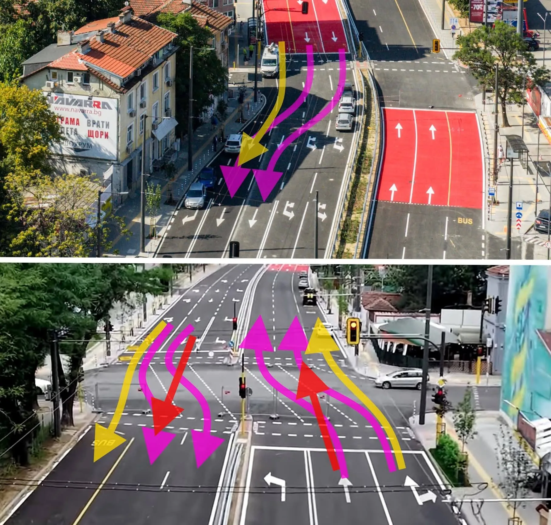 Рубрика " back to school "... Уважаеми " сътрудници " водачи, през днешния ден публично пуснаха " Опълченска " за придвижване, по тази причина дано си напомним някои обикновени правила. На светофара, долу ниско на пътя има едни бели стрелкички указващи ни накъде би трябвало да караме от съответната лента. Малко преди този момент има и табела. Допълнително, в самото кръстовище имаме и едни пунктирани линийки, чиято цел е да ни насочи към вярно прекосяване, а не да караме като коне с капаци единствено напряко... В противоположен случай се получават ей такива ра`оти: