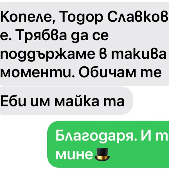 " Копеле, Тодор Славков е. Трябва да се поддържаме в такива моменти. Обичам те. Е.. им майката ", гласи известието от Малък Тошко.