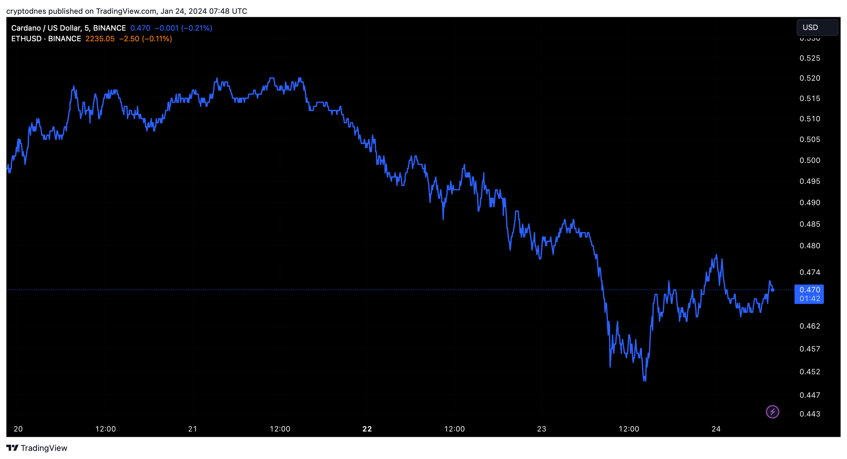 Въпреки този нараснал размер на търговия, ADA се сблъска със незабравим спад от 9.5% през последните сред 22 и 23 януари, достигайки най-ниската си стойност от декември насам – $0.4521. Въпреки това все още на писане на публикацията монетата леко се е възстановила, достигайки равнището при $0.47 отразявайки най-малък спад от 1.4% за деня.