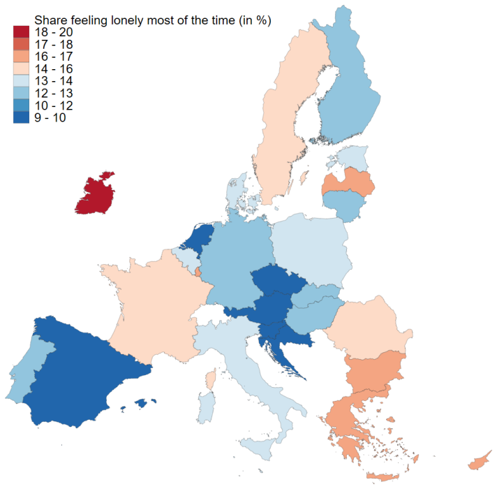 Най-тревожно е ситуацията в Ирландия, където 18-20% признават, че се усещат самотни.