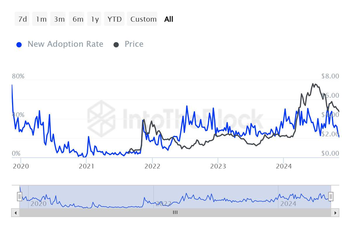 Ключов проблем за Toncoin е ниският % на банкет, който внезапно спада. При едвам 18.64% процентът на приемане е най-ниският от декември 2023 година насам, което посочва неналичието на пресен инвеститорски интерес. Този спад допуска, че новите консуматори намират малко аргументи да се ангажират с мрежата на TON, което от своя страна лимитира способността на криптовалутата да притегля нов капитал и присъединяване.