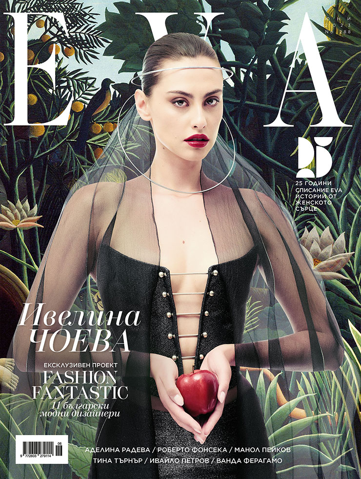 Топмоделът Ивелина Чоева на корицата, държаща алена ябълка и с тоалет на Николай Божилов, на фона на подробност от райската градина на Анри Русо - желаеме това да е поръчка за един специфичен брой, фокусиран върху това по какъв начин Ева въодушевява модата и модата въодушевява Ева.Това е първият от двата специфични броя, с които ще отбележим 25-тата годишнина на списание EVA. Неслучайно в корицата е кодиран откъс на корицата на първия брой на EVA.