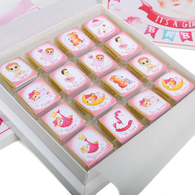 Другото прелъщение за родителите и кръстниците са бонбоните за подарък или почерпка на гостите, в красиво завършени бонбониери с 32 бонбона от тънък млечен шоколад с разнообразни бебешки дизайни и пожелания.