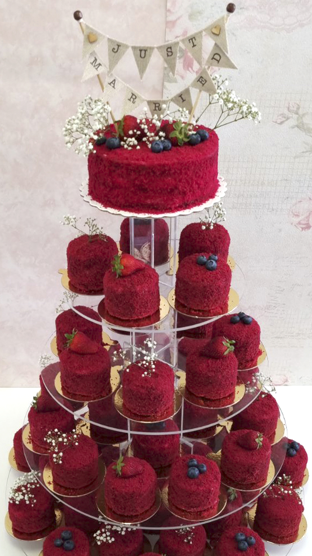 Една другата Сватбена торта с самостоятелни тортички за всеки посетител, декорирани със свежи плодове, a в сърцевината, сочни кадифеночервени блатове, бухнал чийзкрем и малини. Перфектно уравновесен типичен усет. Нарекохме я Ред Форест.
