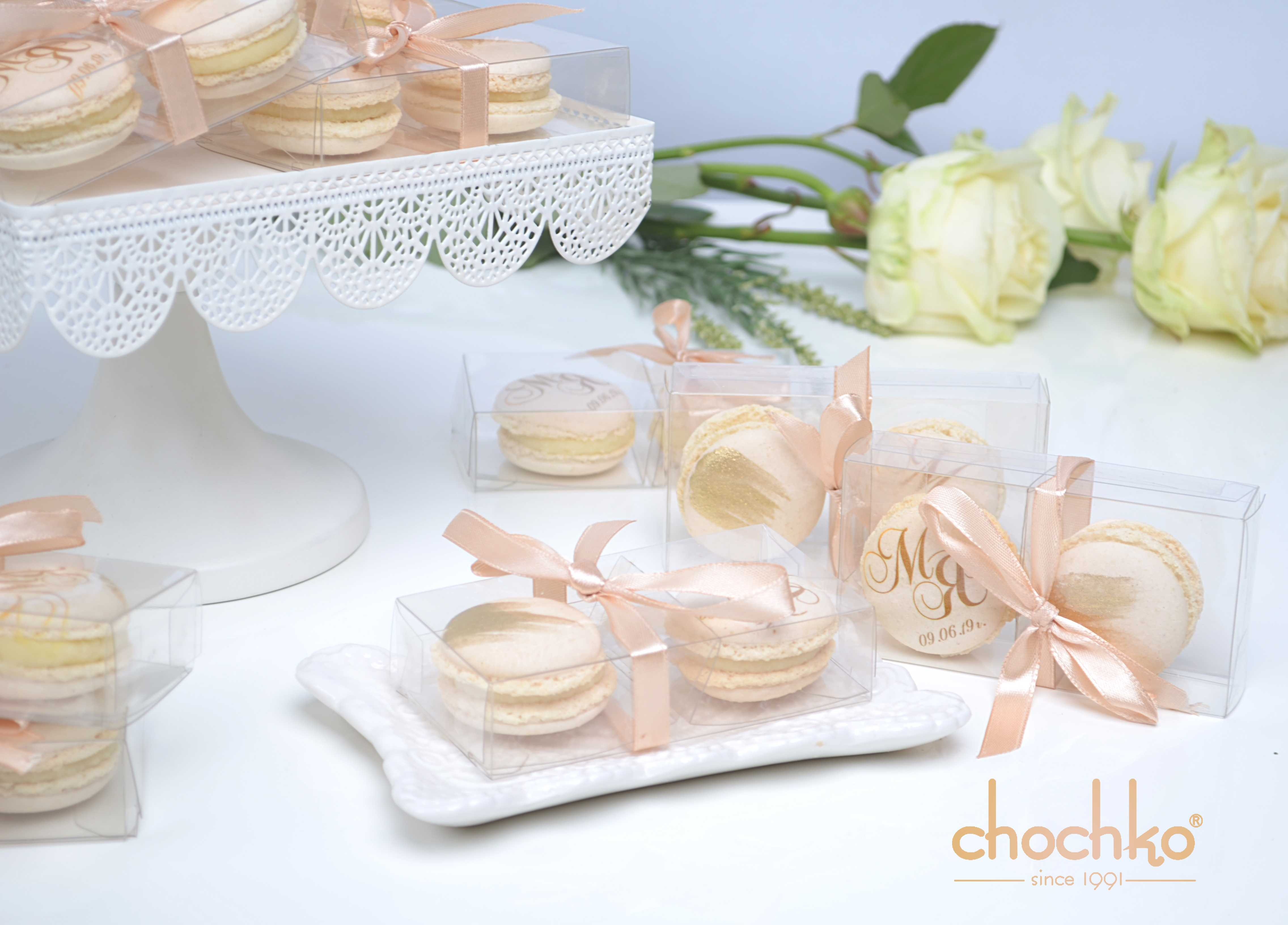 Сладкарницата предлага и сватбени дарове за посетители, като кутийка хрупкави френски макарони персонализирани с буквите на младоженците и датата на сватбата.