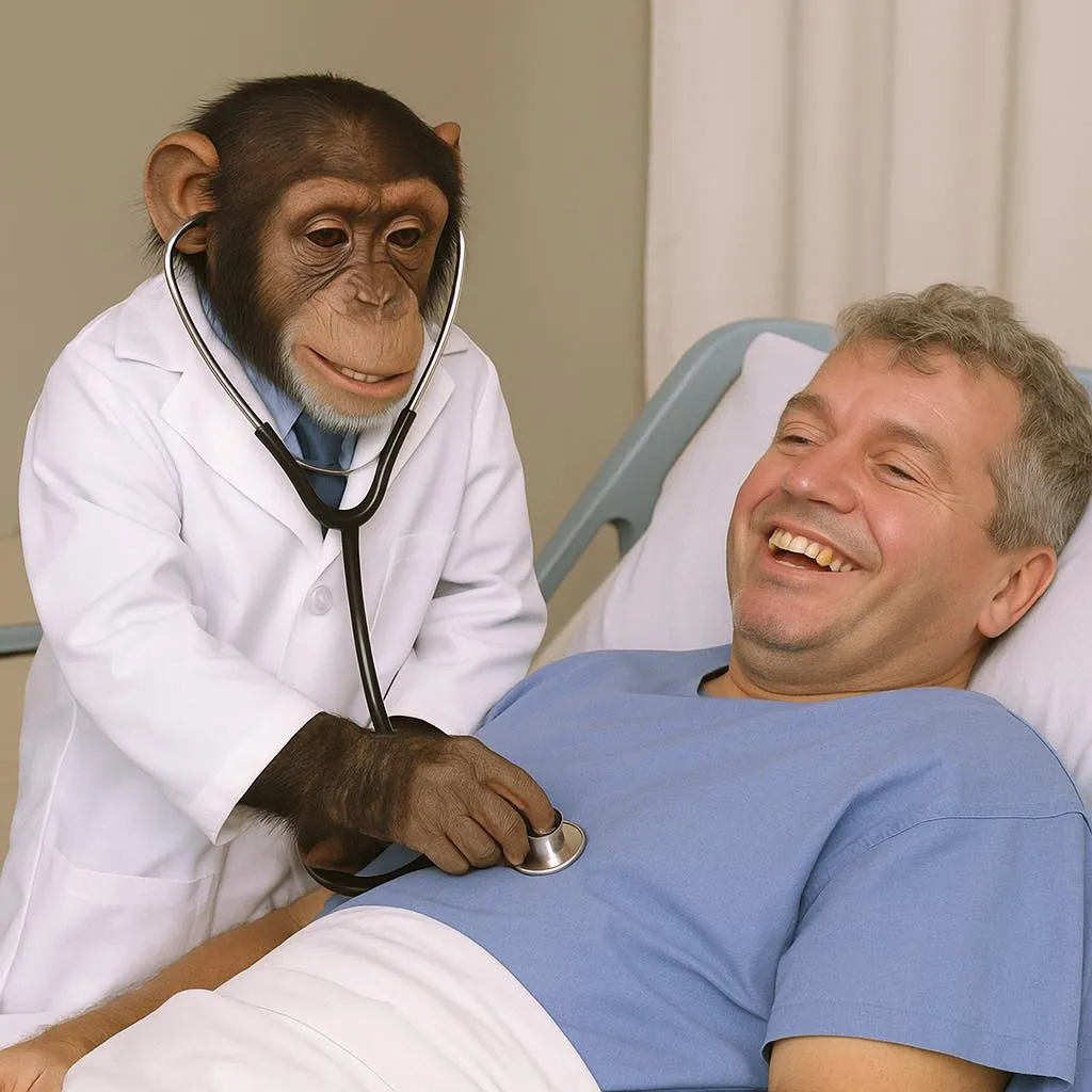 Обезоръжаващо: симпатична шимпанзина с бяла престилка преслушва ухиления Тошко