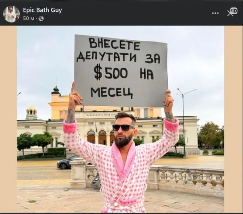 Епичният Bath Guy с розов халат, табела пред Народното събрание — апелът е къс и вцепеняващ: „ Внесете депутати за 500 $ на месец. “ Изразът „ вносна работна ръка “ в никакъв случай не е звучал толкоз изкусително. На тази цена и халатът ще им е длъжностен, че за костюм не остава.