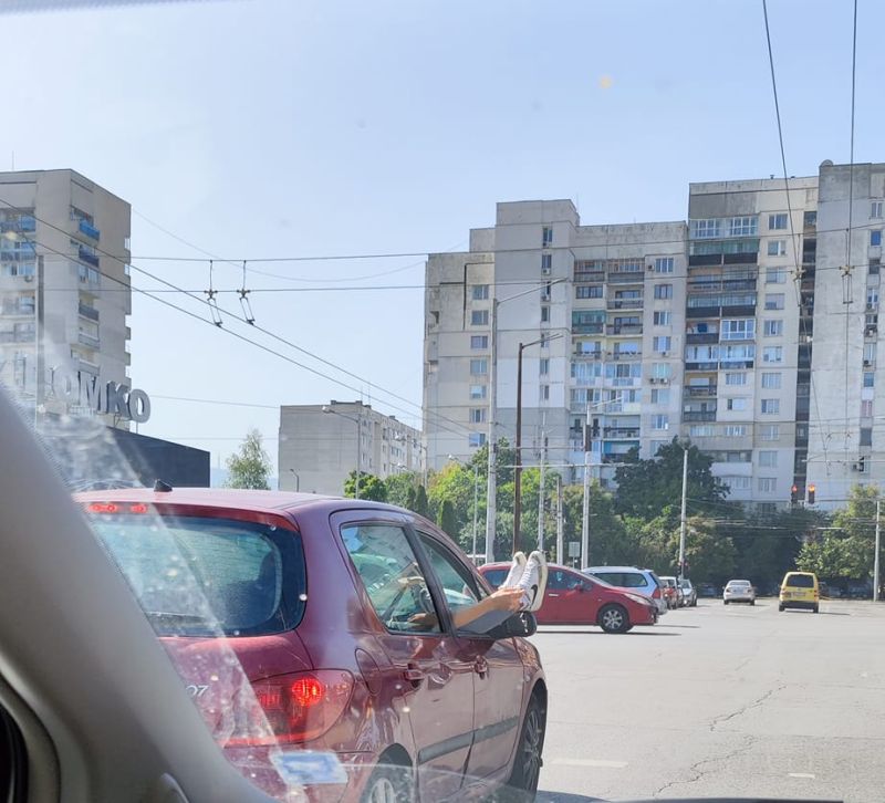 Това е верният метод да се возим! Така столичанин дефинира картинката, която е видял пред себе си и която е снимал - пежо си джътка из софийските улици, а от десния прозорец на колата " са надникнали " дамски крайници. Очевидно е, че дамата на предната седалка се усеща като пет пари в торбичка, проветрявайки нозете си на свежия столичен въздух.
