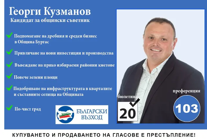 Знаете, че всеки локален парламент кове свои закони. А състава на всеки локален парламент зависи от вашия глас. Та без значение, дали ще гласувате за мен или ще припознаете в своите убеждения различен претендент или партия, значимо е да гласувате. Аз самият ще дам своя глас за един нов, работещ, разрастващ се и чист Бургас! “, безапелационен е Георги Кузманов.