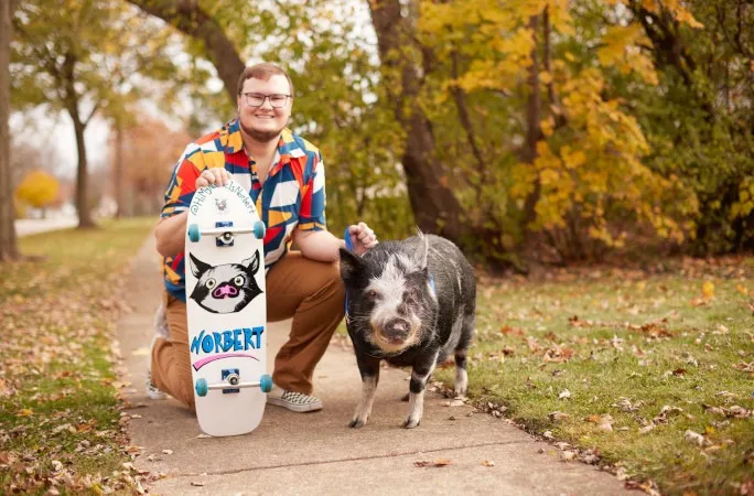 В американския град Бъфало Гроув, в щата Илинойс, едно малко прасе на име Норберт провокира усмивки по целия свят със своите… скейтборд умения. Да, вярно прочетохте - прасе на скейтборд!