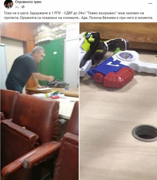 ”Това не е смешка: Задържане в 1 районно управление (на МВР) - Столична дирекция на вътрешните работи до 24ч.! ”Тежко въоръжен ” мъж хванат на митинга. Оръжията са показани на фотосите... ”, написаха от Отровното трио във Facebook в обява за арестуван протестиращ, в който са открити водни револвери.