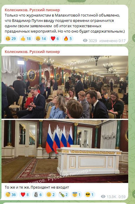 Всички западни публицисти съумяха да заемат местата си на първия ред, заяви журналистът Павел Зарубин. Докато чакат Путин да излезе, всички представители на пресата търпеливо чакат и понякога разгласяват фотоси „ от мястото на събитието “ в обществените мрежи.