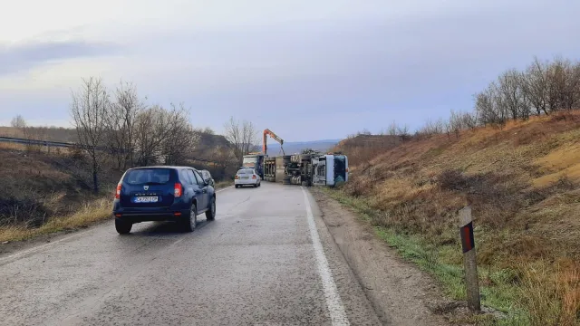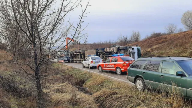 Екипи на пожарната са обезопасили товарния автомобил, а екипи на Областно пътно ръководство обезопасяват пътното платно.