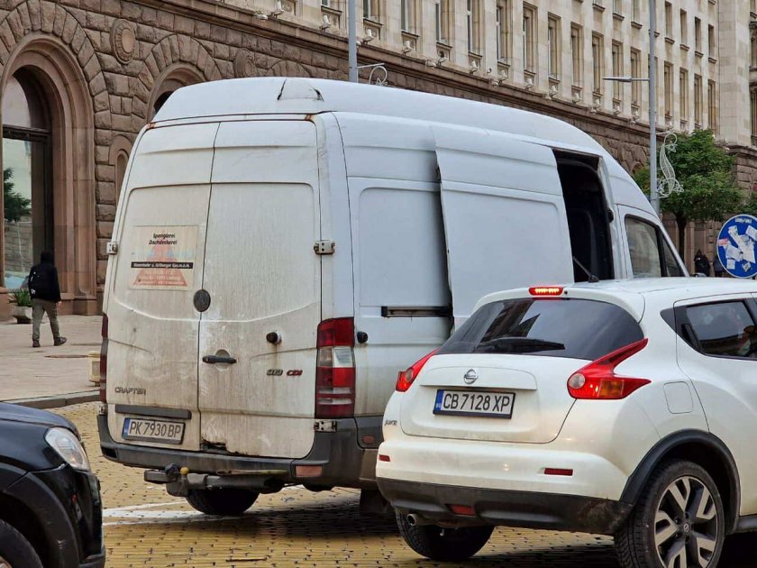 Товарен бус с пернишка регистрация провокира блъсканица пред входа на Народното събрание.