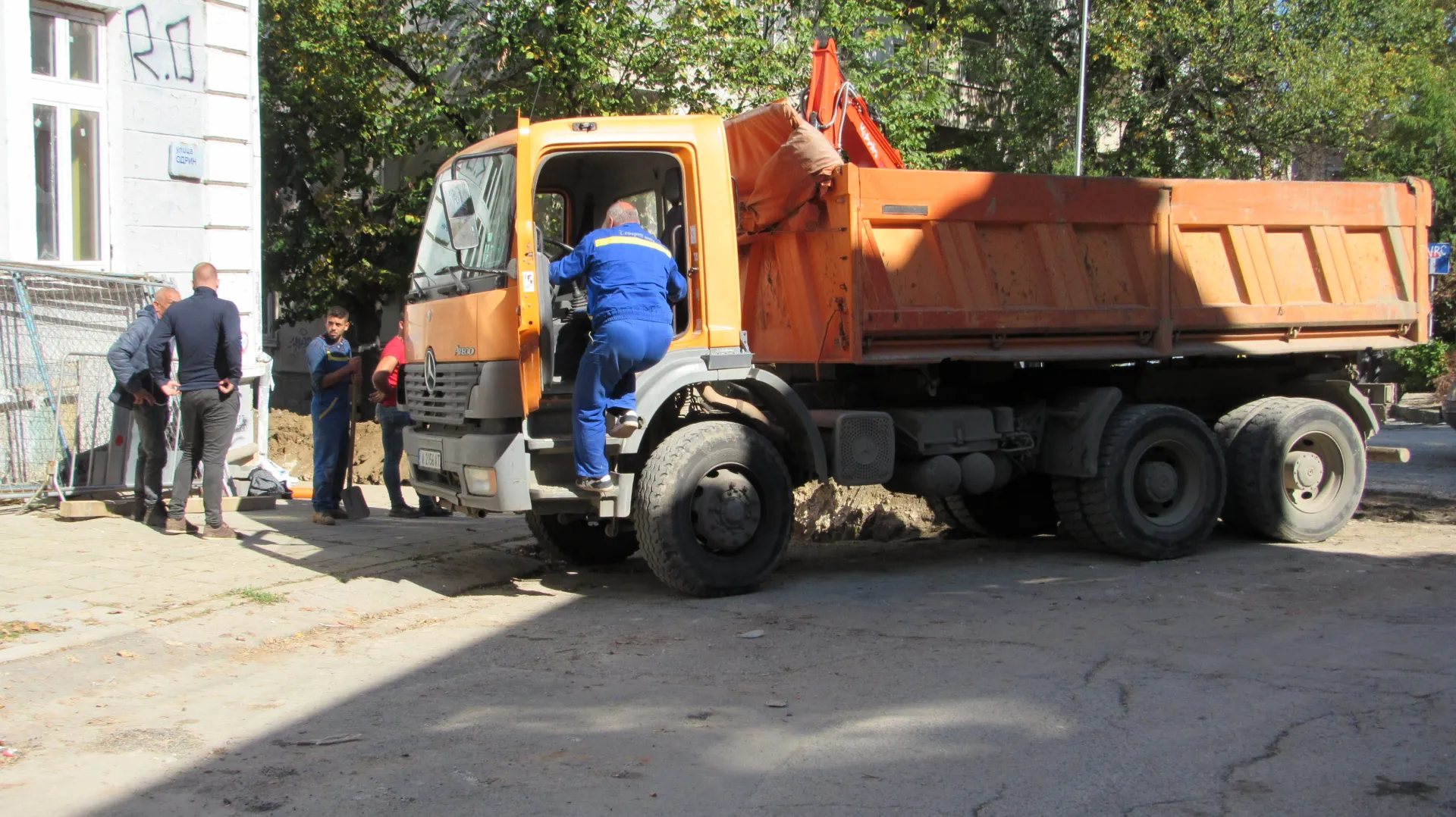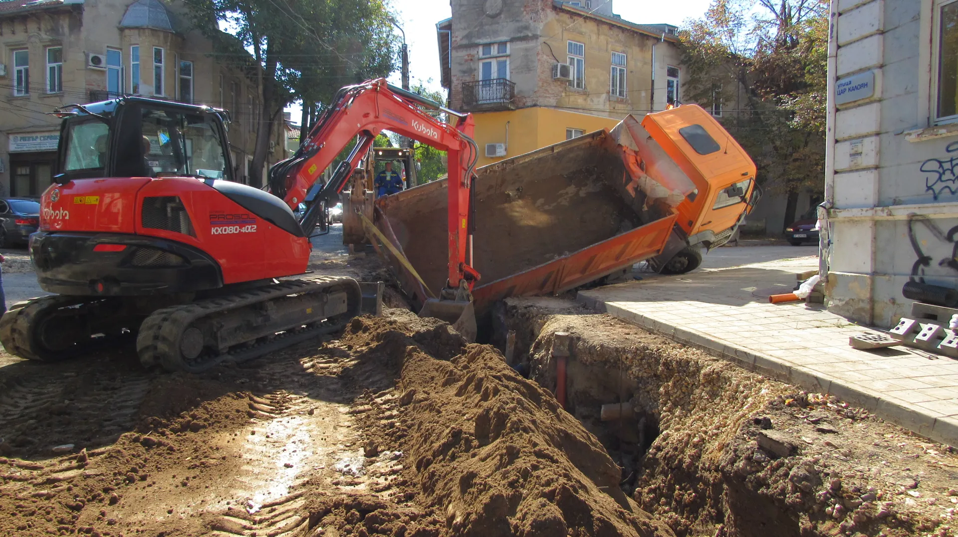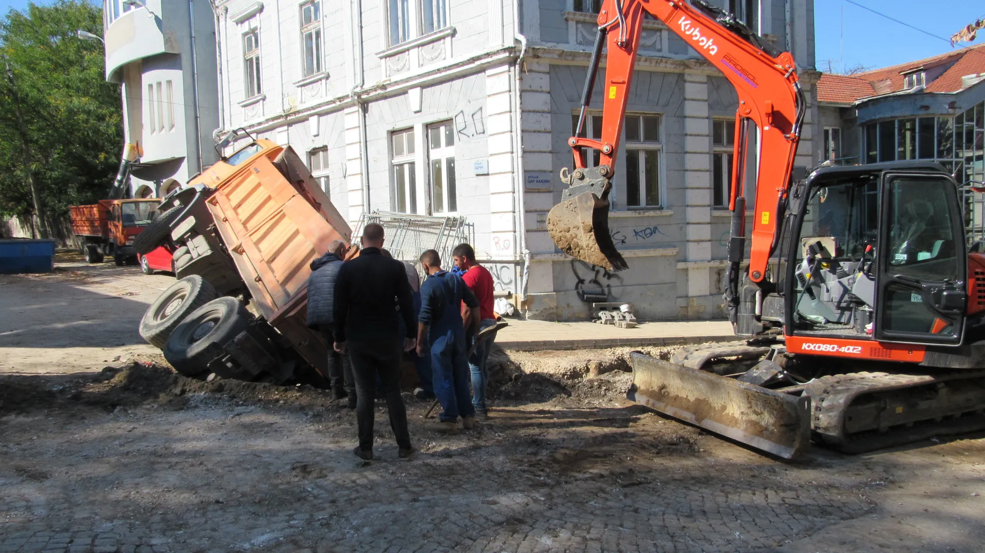 Товарен камион в ров в Русе. Самосвалът е дал на заден ход и е пропаднал в изкопа, където се работи по основен водопроводен клон. По думи на очевидци лидерът е „ изпуснал “ транспортното средство. Няма потърпевши.