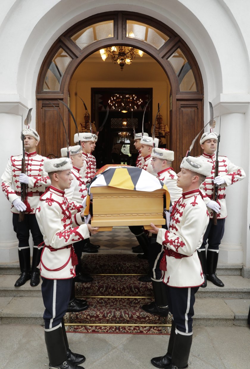 Преди последната права осем гвардейци поеха царския ковчег на рамо и през шпалир от свои сътрудници отнесоха тялото пред входа на двореца, където ги чакаха цар Симеон II и кралица Маргарита, членове на тяхното семейство, както и публични лица, измежду които Васил Терзиев, кмет на София, заместител министър на защитата Иван Пейков, учен Юлиан Ревалски, ръководител на Българска академия на науките, Христо Григоров, ръководител на БЧК, евродепутатите доктор Андрей Ковачев, Андрей Новаков, народните представители Даниел Митов, Тома Биков, доктор Петър Николов, Радомир Чолаков, доктор Йордан Цонев, някогашният президент Росен Плевнелиев, Миглена Кунева, заместник- началникът на защитата генерал-лейтенант Михаил Попов, духовните лица Белоградчишки свещеник Поликарп, първи викарий на Вдовстващия софийски митрополитски трон, архимандрит Евтимий, нравствен надзирател на Софийска епархия и доста други.