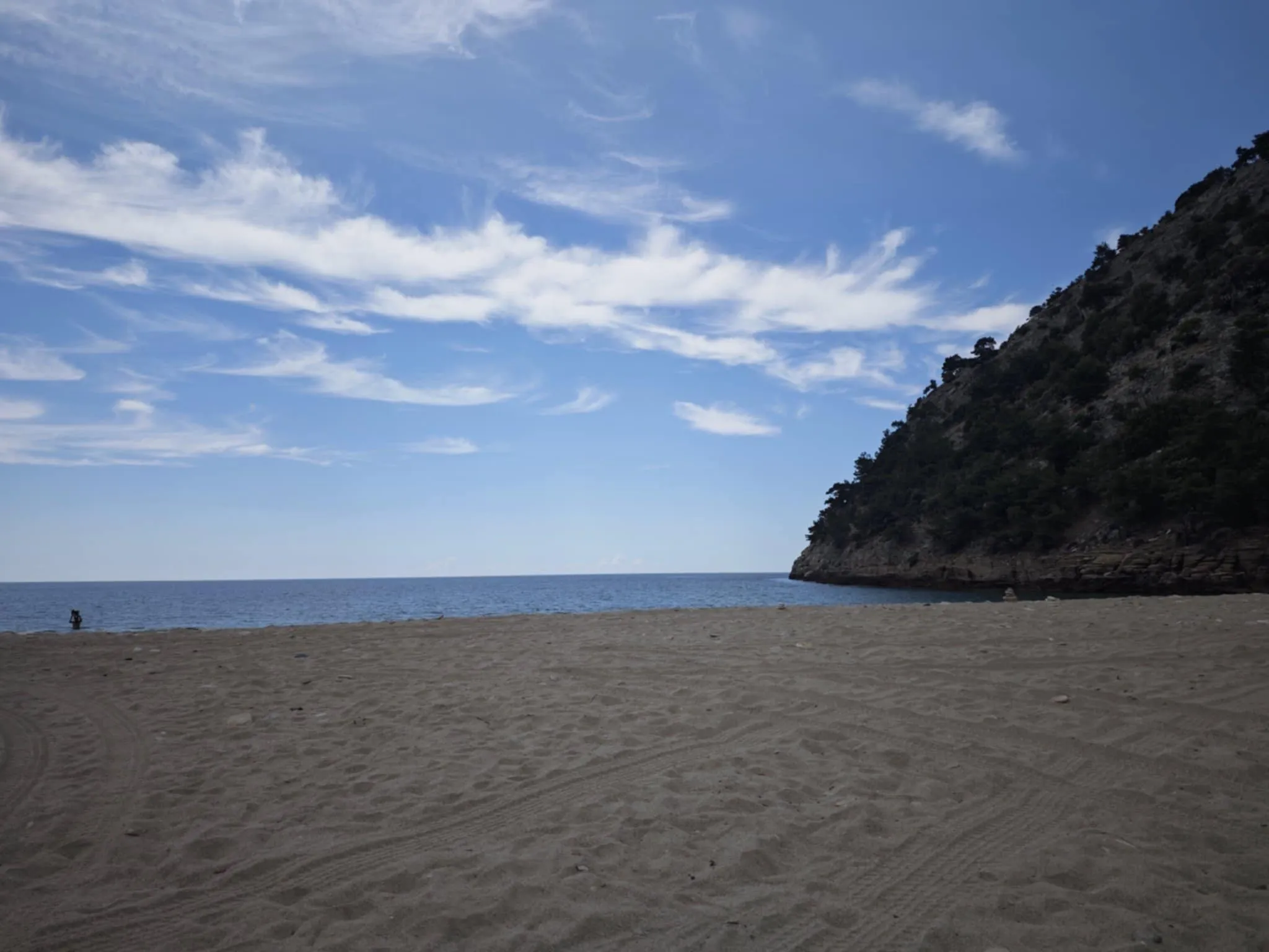 И до сами маслиновите старци – луксозен плаж със стотина метра необятна и 700-800 дълга линия, с мраморен пясък и плитък бряг. Самотен. Една кола в дъното, две лелки с потопени в кристалната вода нозе и млад татко с петгодишен наследник, който учи да плува. Горе, кацнали върху островърхите скали, са кубетата на манастирската църква...