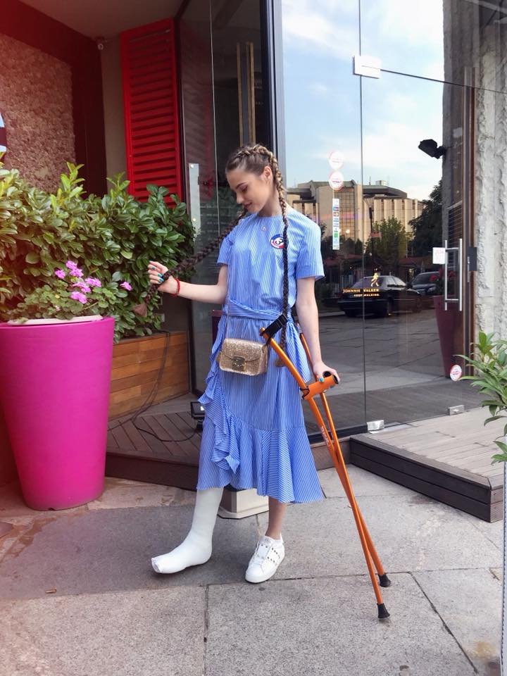 Този уикенд моделката Кристин Илиева се развихри с предпразничен шопинг в столичен мол. Тежко потърпевшата след злополуката с Дивна хубавица, се появи спретната и гримирана като за фешън дефиле – в скъпарска кожена рокля, гъзарски кубинки, маркова чанта, както и неизменимия й аксесоар след случая – патерици.