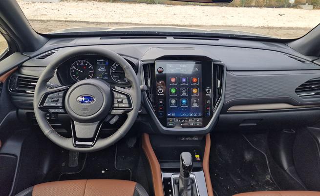 Повечето материали се усещат доста добре на досег, с по-високо качество от всяко друго Subie, което съм карал, а ергономичността на кабината е страхотна. Сензорният екран е смесен с физически бутони, с цел да се улесни боравенето с климатика по време на придвижване. От друга страна обаче не мога да не отбележа обстоятелството, че самата функционалност и скорост на реакция при досег на екрана не може да се мери с тази на съперниците. Трябва да отбелязвам новото безжично зареждане за смарт телефон, както и безжичното свързване на двете операционни системи.
