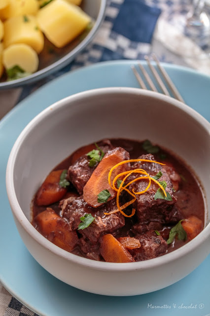 Традиционната рецепта за Говежда яхния с вино или Daube de bœuf е с провансалски генезис и за нея е особено дългото авансово мариноване на говеждото (телешкото) месо в алено вино с лук и подправки, след което яхнията се оставя да се готви дълго време в соса от маринатата на спокоен огън. Тази е интерпретация на класическата рецепта с леко другоземен привкус от портокалите и джиджифила и компактност от черния шоколад. Ако държите на обичайния усет, махнете портокалите, джинджифила и шоколада и прибавете малко мащерка за мирис.