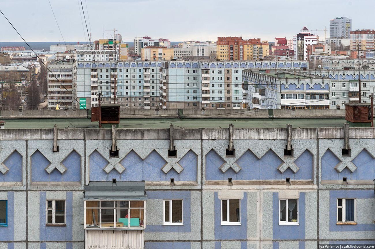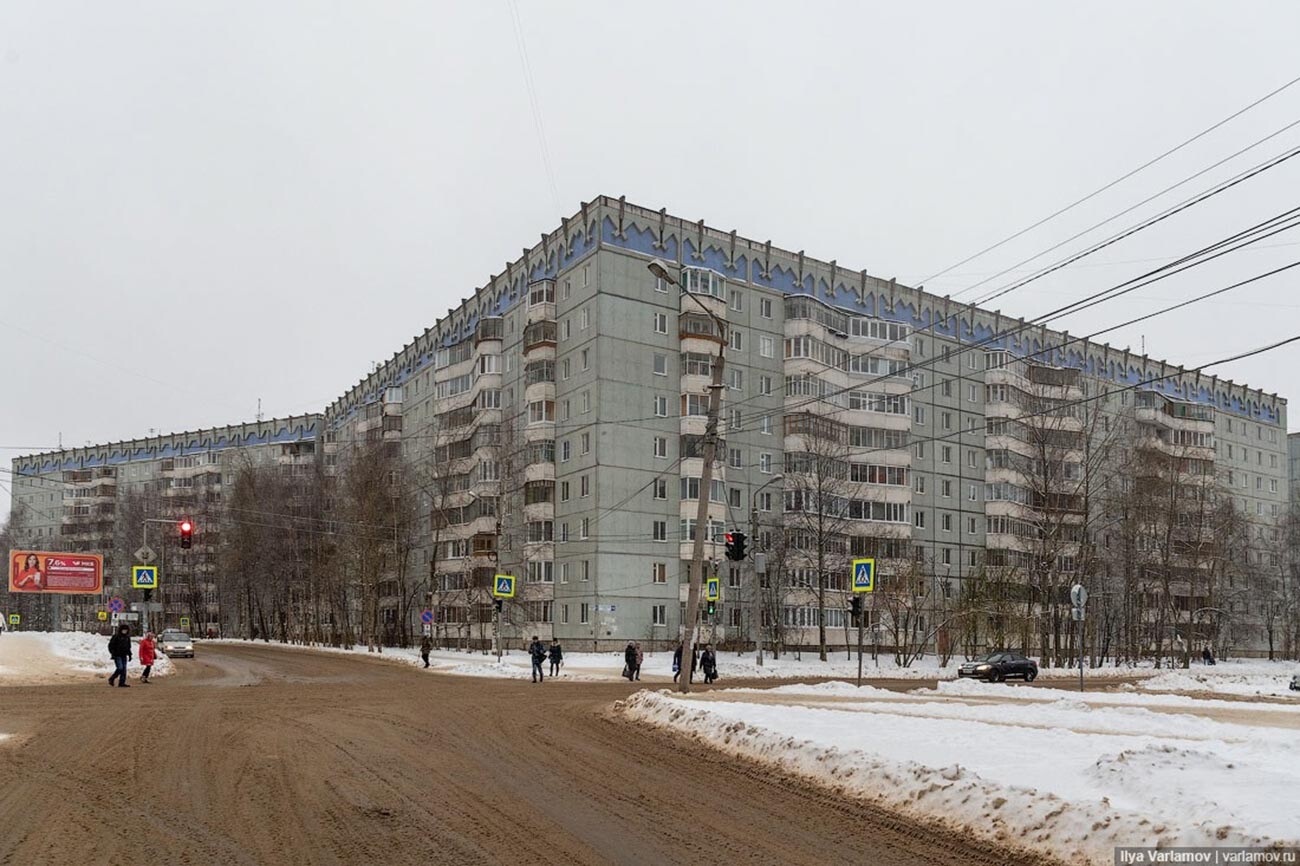Иля Варламов (CC BY-SA 4.0) Един квартал в северния съветски град Сиктивкар е цялостен с панелни блокове с фолклорни детайли от Коми.