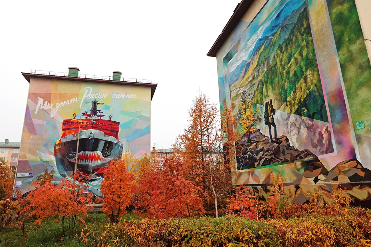 Мария Плотникова/Sputnik Салехард е единственият град, издигнат навръх Полярния кръг. Климатът в Далечния изток е необработен и локалните домове са боядисани в ярки цветове. В Салехард типичните руски панелни блокове са украсени с впечатляващи стенни рисунки на айсберги, лисици и елени.