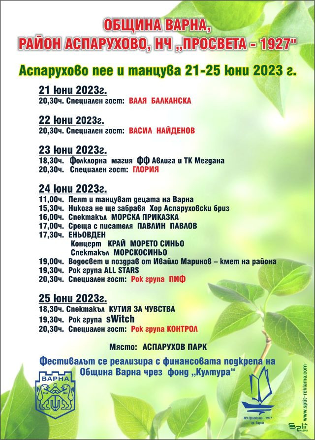 Тазгодишното издание ще открие великата Валя Балканска на 21 юни (Сряда) от 20:30 ч. В предишното под звуците на неповторимата българска сцена ще ни върне невероятният Васил Найденов. Той и неговите незабравими шлагери ще озвучат парка на Аспарухово на 22 юни ( четвъртък).
