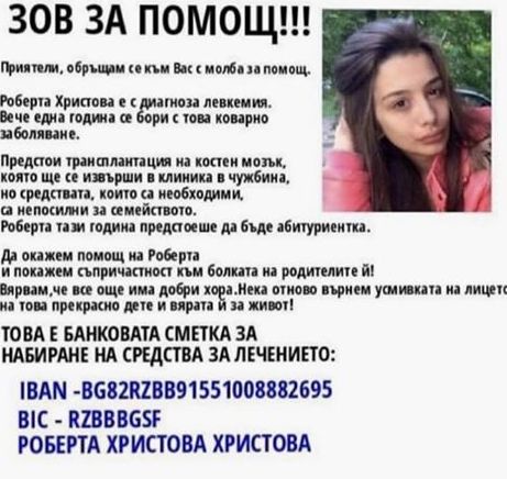 Вярваме, че скоро Роберта ще бъде още веднъж здрава, ще бъде измежду своите съученици в учебно заведение, където ще мечтае за своя бал и ще прави проекти за своето бъдеще!