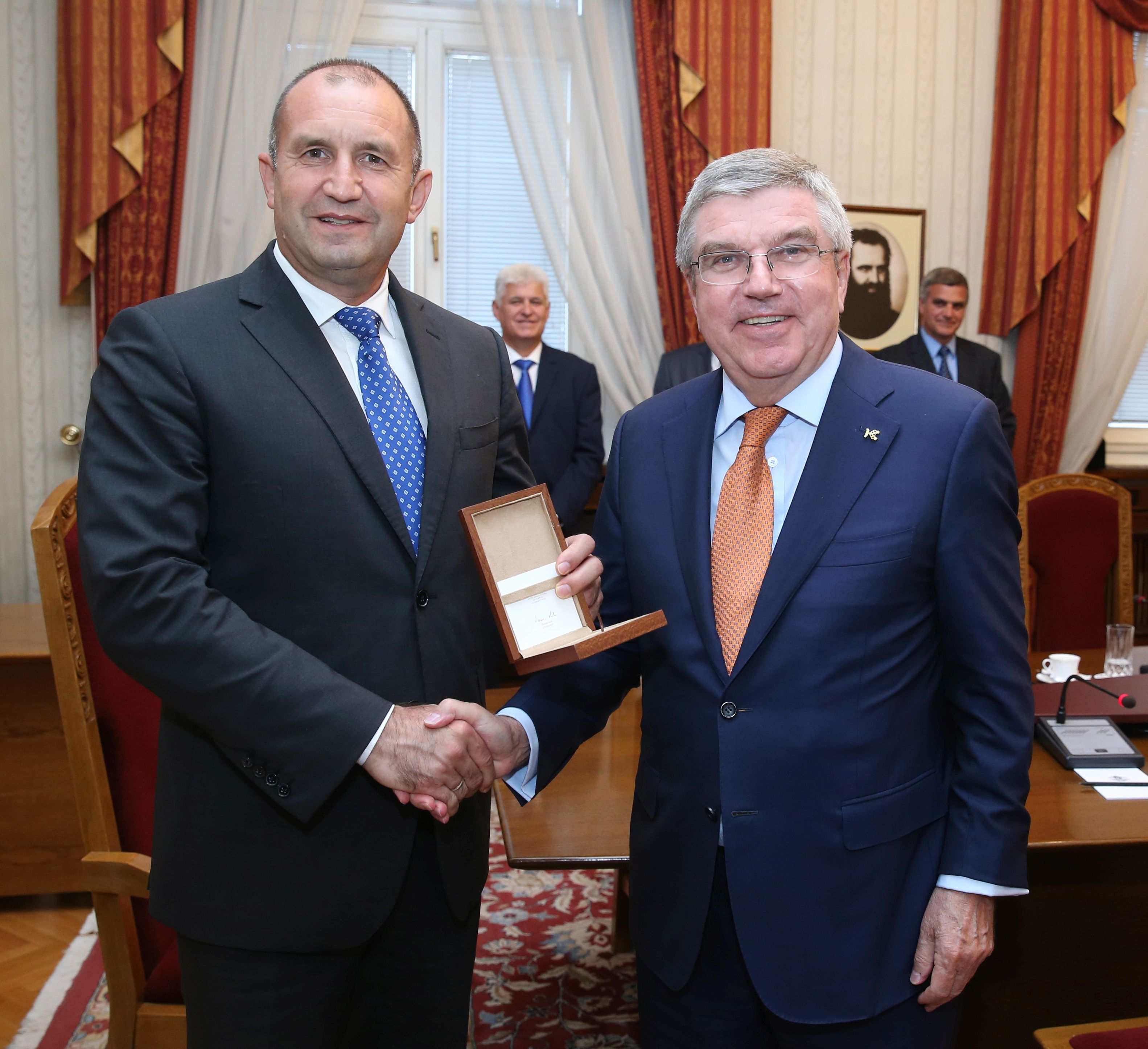 Томас Бах връчи специфичен олимпийски орден на президента и го предложения да посети олимпийската централа в Лозана идната година. „ Там ще ви покажа входа на олимпийския музей, пред който стои летва с височина 209 см и знак за към момента неподобрения международен връх на великата Стефка Костадинова, “ сподели още президентът на МОК Томас Бах.