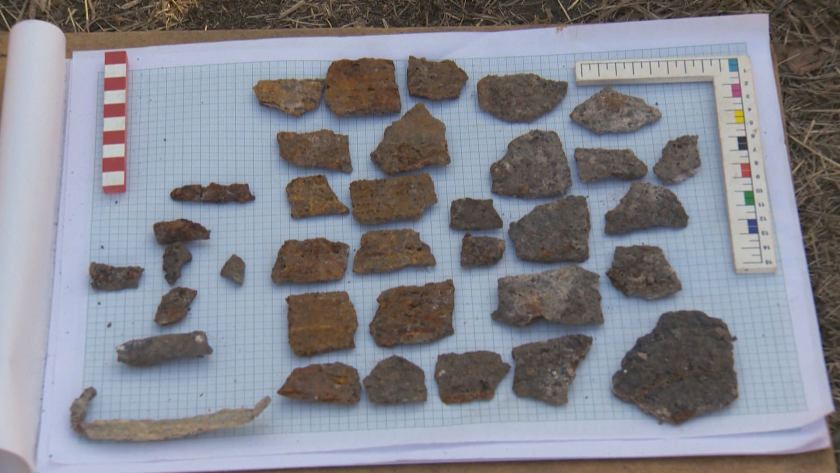 " Любопитно е да ви покажа една обстановка, която и нас ни озадачава. Тук виждаме фрагменти, затиснати от този блок на пластинчата броня. Това е броня, която е построена от дребни пластини, които са пришити към кожена или платнена дреха. Виждаме тук 7-8 такива ", съобщи доцент доктор Георги Нехризов, началник на археологическите разкопки.