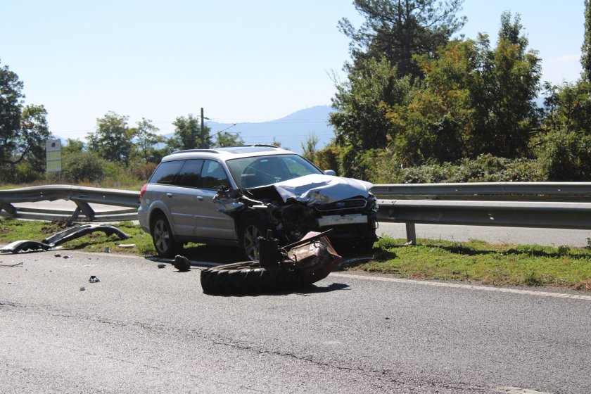 След удара в откъснатото колело, лекият автомобил се забива в мантинелата, разделяща двете платна на пътя.