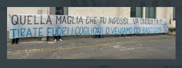 Транспарант със застрашителен текст към играчите се появи пред базата на. Той е дело на тифози на от фракцията “Curva Nord” и в символ на неодобрение от неуверените изяви на отбора на.