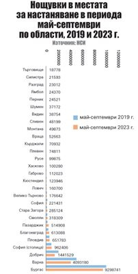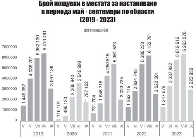 Сравнението на общия брой нощувки за петте месеца на деен летен сезон по Черноморието сред май и септември сочи съвсем цялостно възобновяване – през 2019 година осъществените през този интервал нощувки в страната като цяло са били малко под 21 млн., през 2023 година – 19,7 млн.