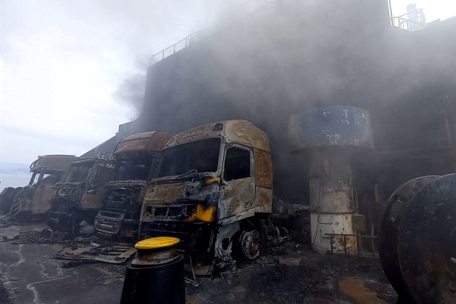 Тировете във ферибота са изцяло изгорели, очевидно от фрагментите на Спасителната морска пожарна.