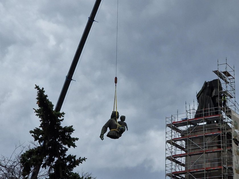 Трети ден унищожаването на Паметника на Съветската войска продължава по проектите на ръководещата сглобка. Преди минути бяха отрязани и фигурите на майката с детето.