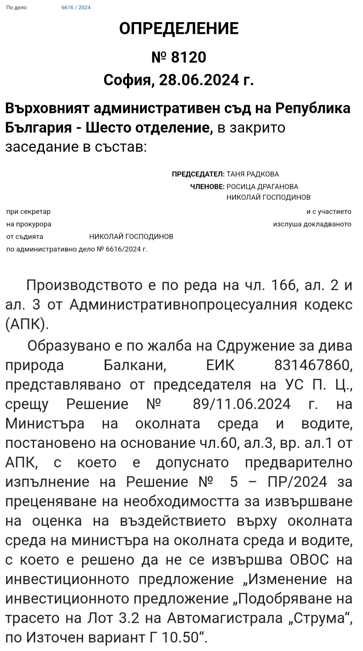 Тричленен състав на Върховния административен съд отхвърли жалбите на две екологични неправителствени организации, които оспорват довършването на Автомагистрала " Струма " по трасето от Кресна към София.