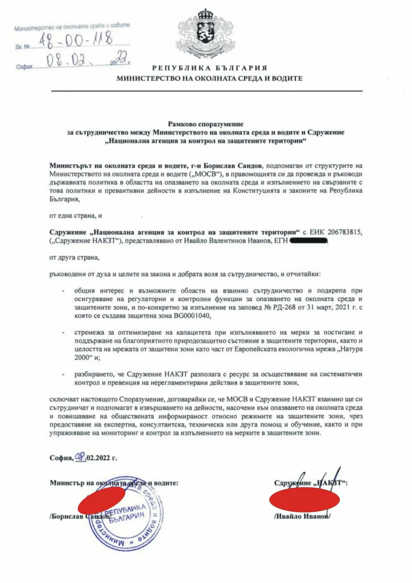 " Няма подписан контракт, а рамково съглашение, което не основава права и обвързване нито за Министерство на околната среда и водите, нито за организацията. Това е Неправителствени организации и подобен вид има доста в България и света. А това съглашение си го представете като притискане на ръце пред камери, че ще пазим дружно природата - лист хартия и е с атрибутите на рамково съглашение, само че не основава права и няма финансов ангажимент ", изясни Сандов.