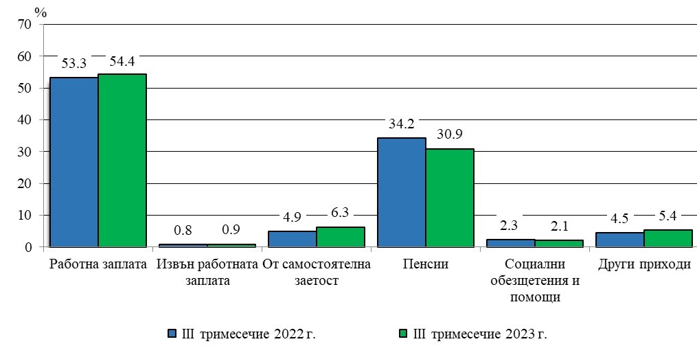 В структурата на общия приход с най-голям условен дял е приходът от работна заплата (54,4%), следван от приходите от пенсии (30,9%) и от независима претовареност (6,3%). Спрямо третото тримесечие на 2022 година относителният дял на прихода от работна заплата се усилва с 1,1 процентни пункта, а на прихода от независима претовареност - с 1,4 процентни пункта. Делът на приходите от пенсии понижава с 3,3 процентни пункта.
