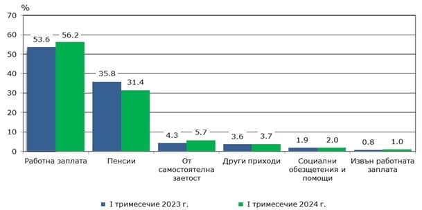 Спрямо първото тримесечие на 2023 година относителният дял на прихода от работна заплата се усилва с 2,6 процентни пункта, а на прихода от независима претовареност - с 1,4 процентни пункта. Делът на приходите от пенсии понижава с 4,4 процентни пункта.