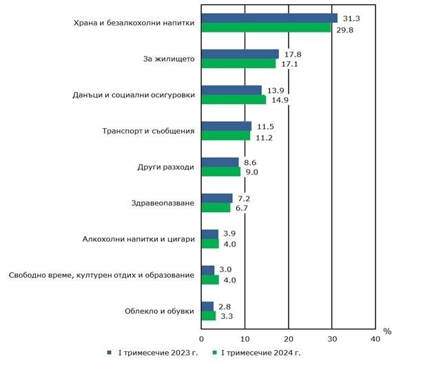 Спрямо първото тримесечие на 2023 година относителният дял на разноските за храна и безалкохолни питиета понижава с 1,5 процентни пункта, а делът на разноските за жилище - с 0,7 процентни пункта. Относителният дял на разноските за налози и обществени осигуровки и разноските за свободно време, културен отдих и обучение нарастват с 1,0 процентен пункт.