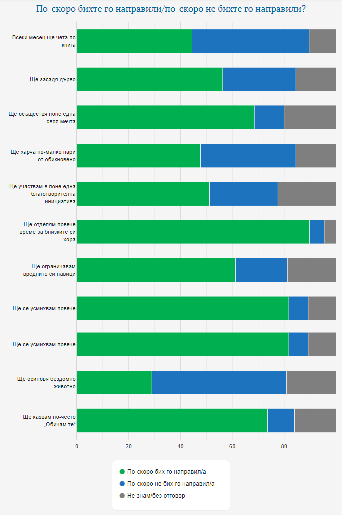 Прави усещане, че няма огромен възторг и за осиновяване на бездомно животно , това си дават обещание 29%, както и за четене на книга – 44,5 на 100.
