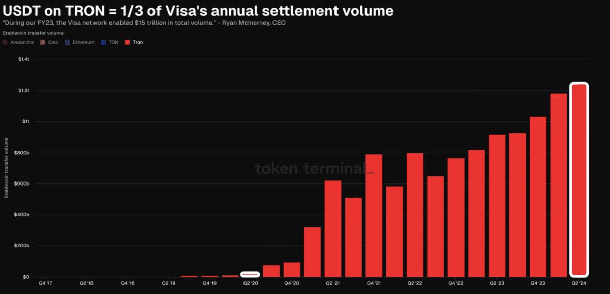 Tron (TRX) се нарежда като сериозен противник на Visa в областта на цифровите разплащания, като през второто тримесечие на 2024 година размерът на сетълмента на USDT ще доближи $1.25 трилиона.