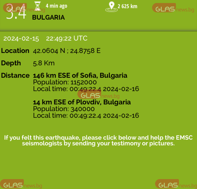 Земетресението е било с магнитуд 3.4 по скалата на Рихтер, а епицентърът е сред Пловдив и Асеновград в региона на село Крумово. Трусът е станал 10 минути преди 1 часа тази нощ, а дълбочината му е била на 5,7 км.