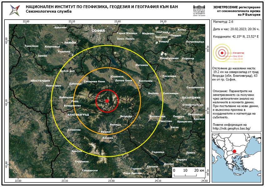 Епицентърът е на 63 км от град София и е с дълбочина 8,4 км.