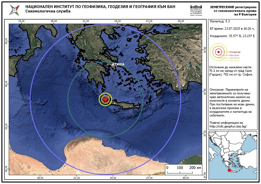 Земетресение с магнитуд 5.3 по скалата на Рихтер е записано през днешния ден в региона на остров Крит, Гърция.