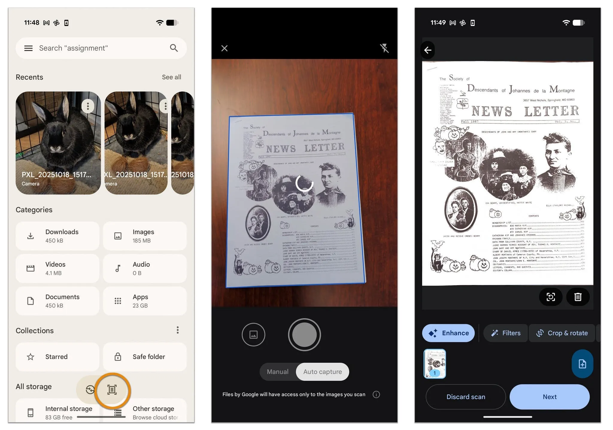 Приложението Files на Google за Android може да основава и съхранява PDF документи, както и да дава други функции за ръководство и почистване . За да сканирате документ с приложението Files , докоснете дребната икона на документ и използвайте камерата на телефона, с цел да заснемете изображението, което можете да редактирате и запазите или да изпратите на някой различен.
