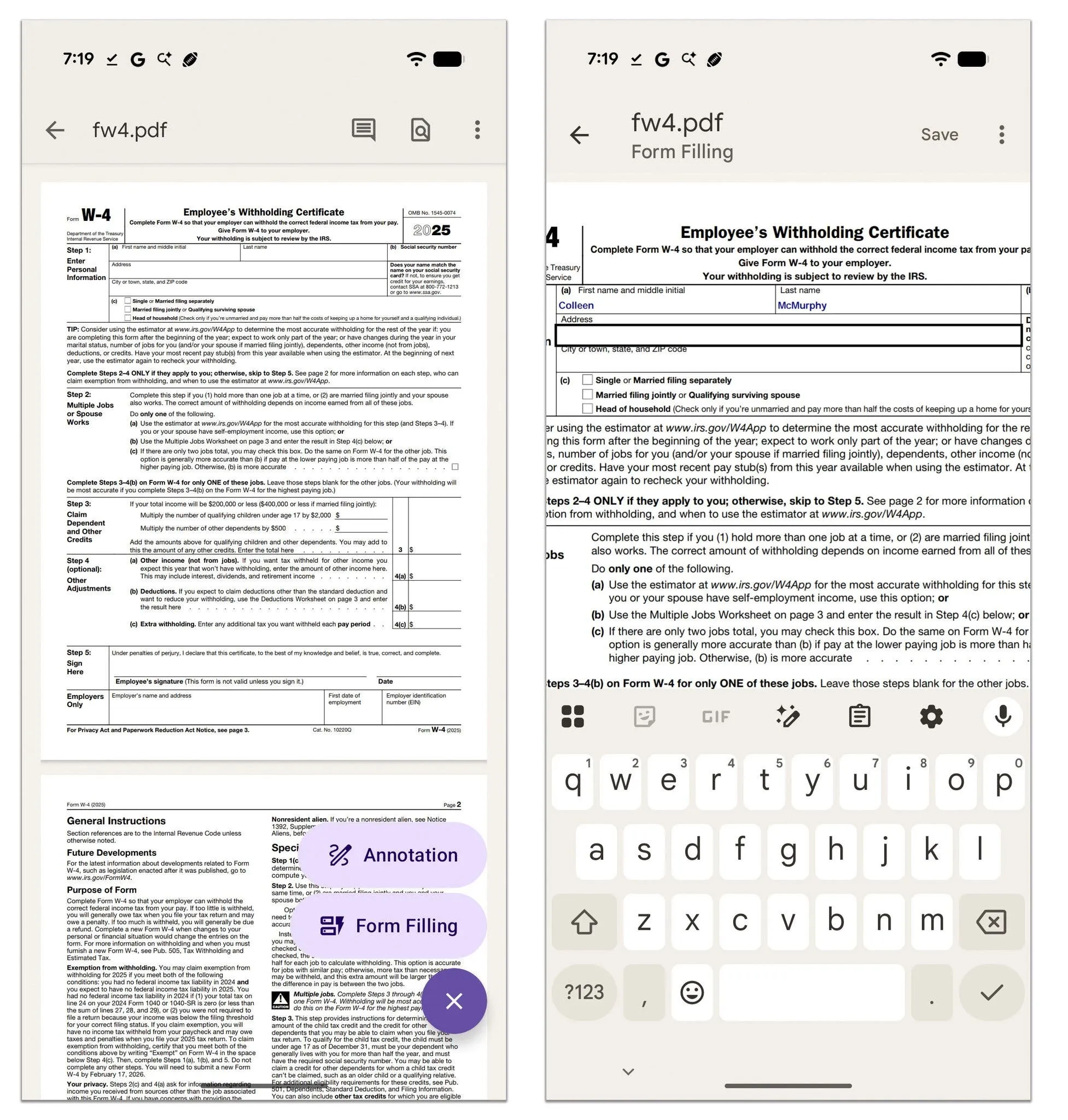 За да добавите информация към PDF формуляри, изпратени по имейл , които имат редактируеми текстови полета , запазете файла в Гугъл Drive и по-късно го отворете още веднъж с приложението Гугъл Drive. Докоснете иконата на молив от дясната страна на екрана и изберете „ Попълване на формуляри “. Когато сте подготвени, докоснете „ Запазване “ (или „ Запазване като “, с цел да извършите копие) и прикачете попълнения формуляр към отговор по имейл.